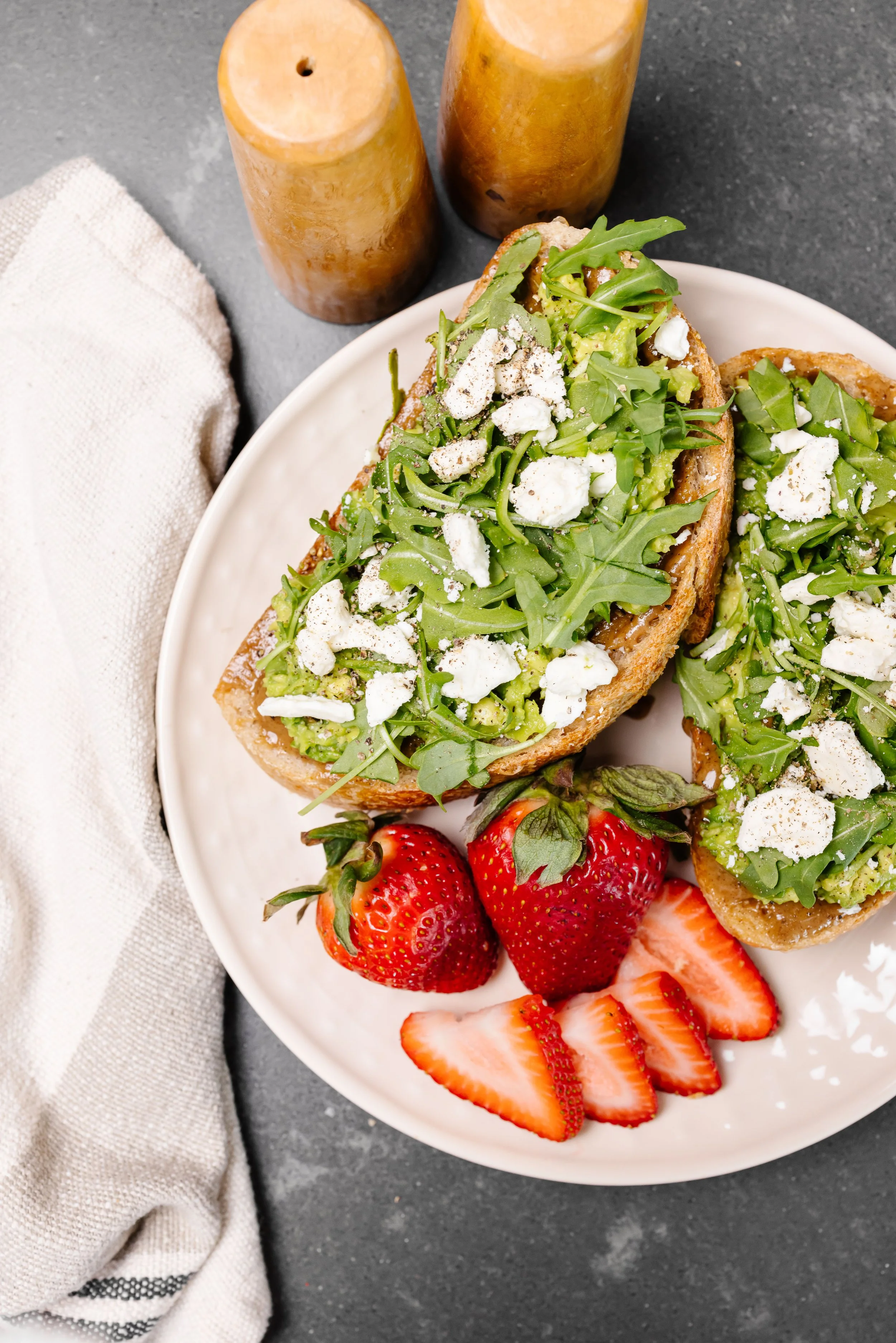 Spread avocado on toast and top with a squeeze of lemon, arugula, basil, feta, drizzle of olive oil and sea salt flakes.