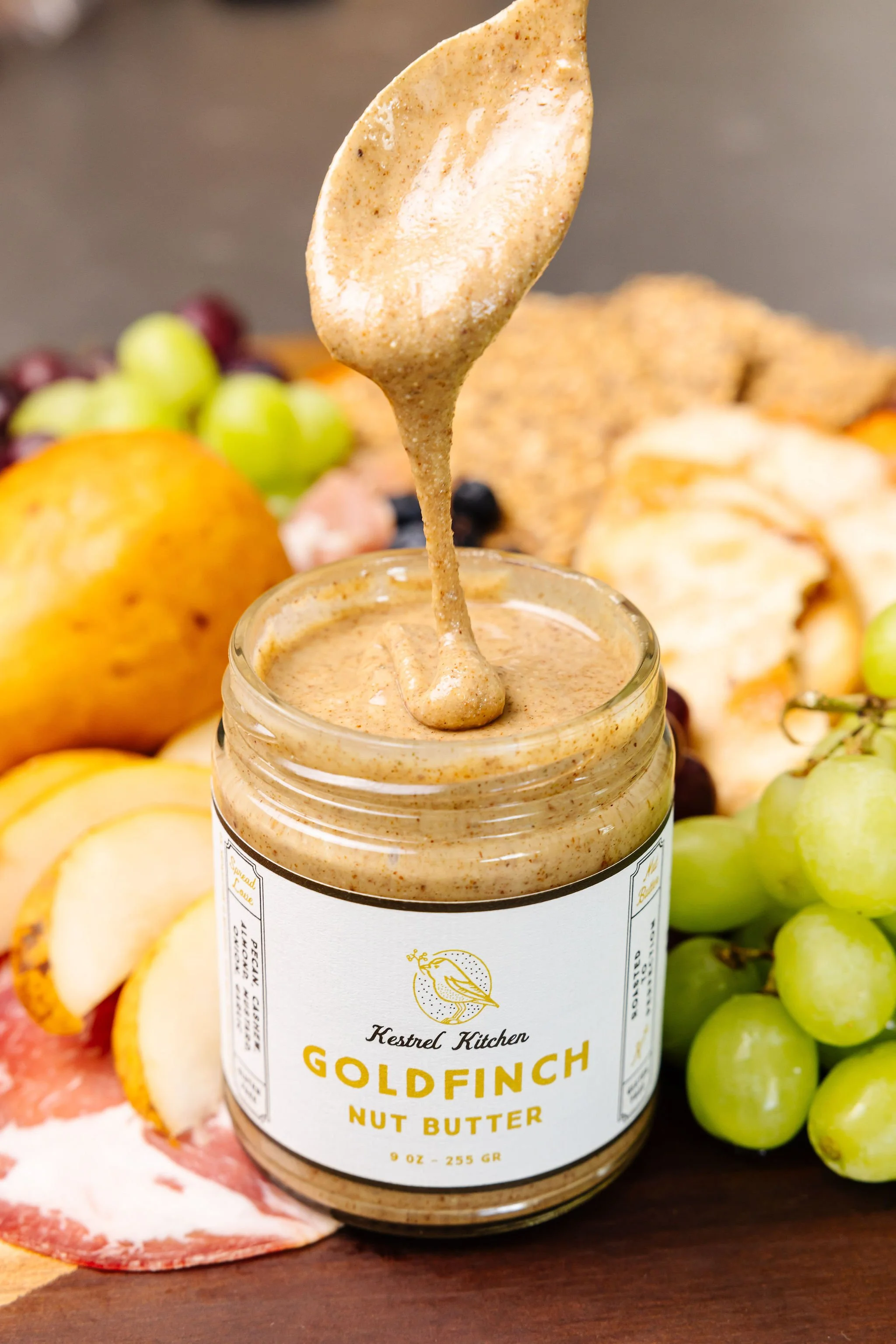 Goldfinch is savory with a little zing and a hint of sweet. Pecans, cashews and almonds blended with dried herbs and a touch of honey. We recommend as a dip with pretzels or veggies or as a delicious alternative to a sandwich spread.